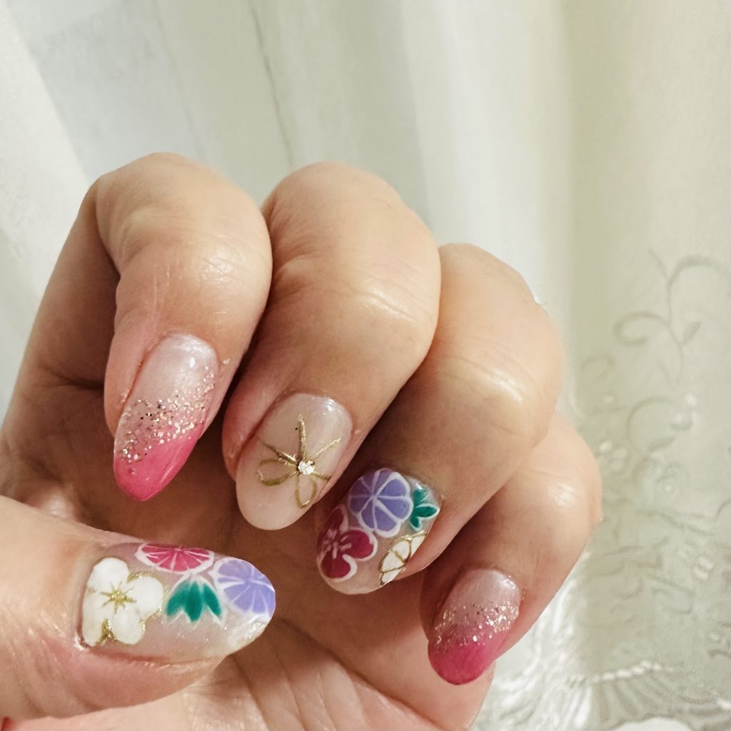 爪の根元が透明のグラデーションは、爪が伸びた時に、爪とネイルの境目がわかりにくいので、気になる人におススメです。